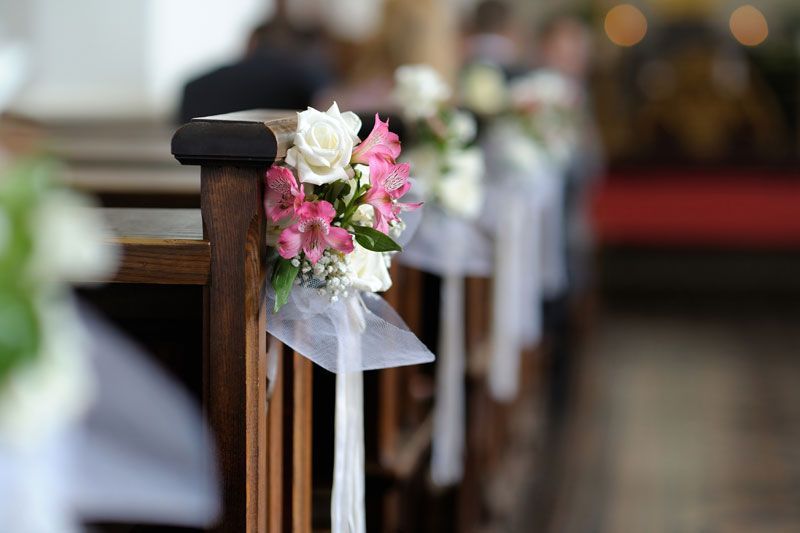 Die Kirche ist bei der Hochzeit oft der stimmungsvollste Ort. Hier beginnt die Hochzeitsfloristik beim filigranen Türschmuck. Ferner sorgen Blumen als Bankschmuck für Atmosphäre. Die Stühle des Brautpaars sind ebenfalls mit zarten Blüten gespickt. Perlenbänder, elegante Spitze und verspielter Zierdraht runden die festliche Floristik ab.